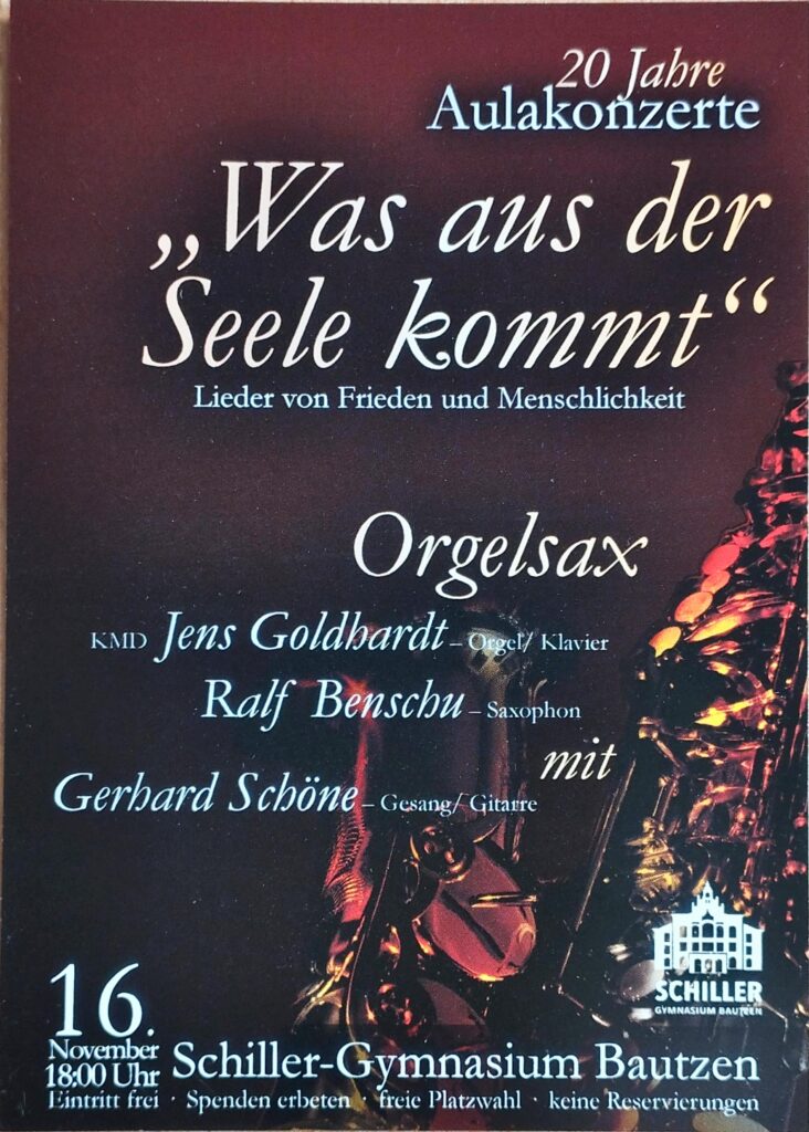 Als im Januar 2005 das erste Aulakonzert veranstaltet wurde, ahnte wohl niemand, dass daraus eine 20 jährige Tradition und eine beliebte Konzertreihe entstehen würden. Anl. dieses Jubiläums laden wir Sie/ Euch ein in ein Konzert mit dem Duo OrgelSax (Kirchenmusikdirektor Jens Goldhardt/ Orgel und Jazz- und Rockmusiker Ralf Benschu/ Saxophon) sowie dem bekannten Liedermacher Gerhard Schöne. In einem seiner Lieder singt er „Das, was aus der Seele kommt, sucht Raum in einem Lied“. In dem Programm voller Poesie, mal leicht beschwingt und mal ergreifend ernst erklingen Lieder aus seinem großen Repertoire, die einfühlsam von Frieden und Menschlichkeit erzählen und in unseren oft aufgeheizten und kriegerischen Zeiten den Weg in unsere Herzen suchen.