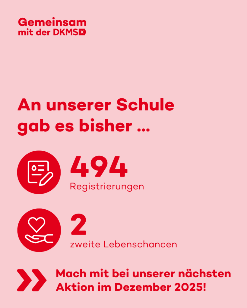 Am 19.12.2025 haben alle Schülerinnen und Schüler ab 17 Jahren die Möglichkeit, sich unkompliziert mit einem Wangenschleimhautabstrich bei der DKMS registrieren zu lassen. Die Teilnahme ist selbstverständlich freiwillig, kostenlos und kann jederzeit widerrufen werden. Die Daten von 17-Jährigen bleiben bis zum 18. Geburtstag sicher gesperrt und werden erst dann pseudonymisiert in die weltweite Suche aufgenommen.